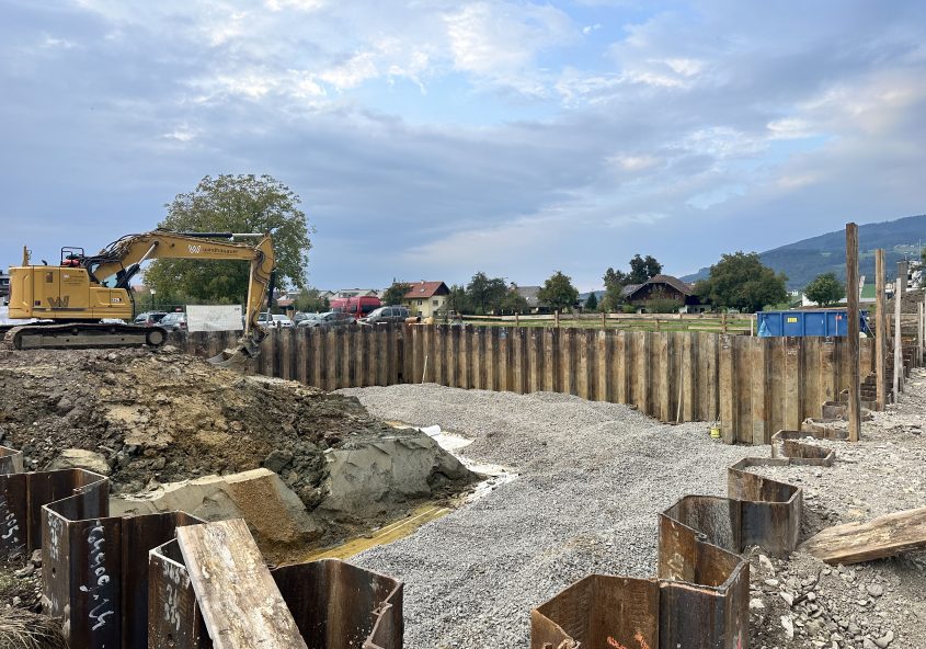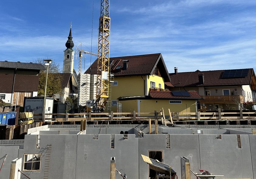 In der Bahnhofstraße 14 entstehen 12 moderne Wohnungen mit Tiefgarage – der Bau schreitet dank idealer Wetterbedingungen und engagierter Arbeit rasch voran.